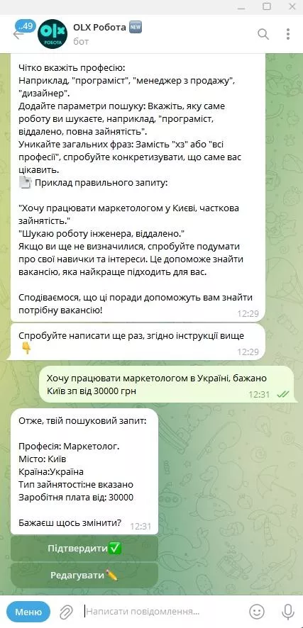 Мы добавили в этот чат-бот АI, и теперь он может из любого запроса, написанного в произвольной форме, собрать сообщение для подписки на вакансию, уточнить у человека, правильно ли он понял запрос, а далее оформляет подписку. Теперь вместо длительного клика и выбора нужных категорий пользователь одним предложением опишет, что именно ищет. ИИ распределит это по соответствующим полям, что позволит комфортно и быстро создать необходимую подписку на вакансии.