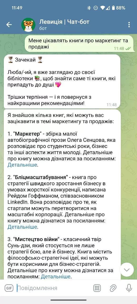 В этих чат-ботах от нашей команды ИИ получает запрос от пользователя, анализирует товарный фид магазина и подбирает книги для рекомендации.