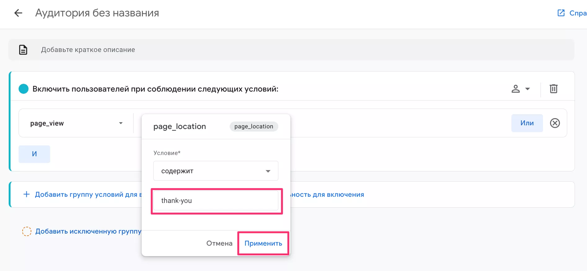 Если нужно, чтобы пользователь одновременно соответствовал нескольким условиям — например, перешел на страницу благодарности и находится в определенной стране, — воспользуйтесь кнопкой «Добавить группу условий». Это позволит комбинировать несколько критериев для точного таргетинга.