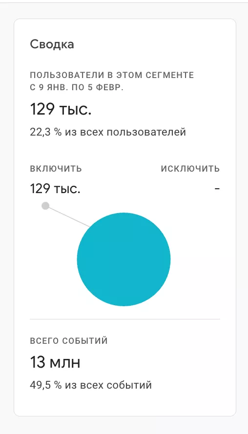 В то же время сегменты могут анализировать исторические данные. Например, достаточно создать сегмент «все, кто совершил покупку в апреле» — и он сразу отобразит таких пользователей, даже если сегмент создан в мае.