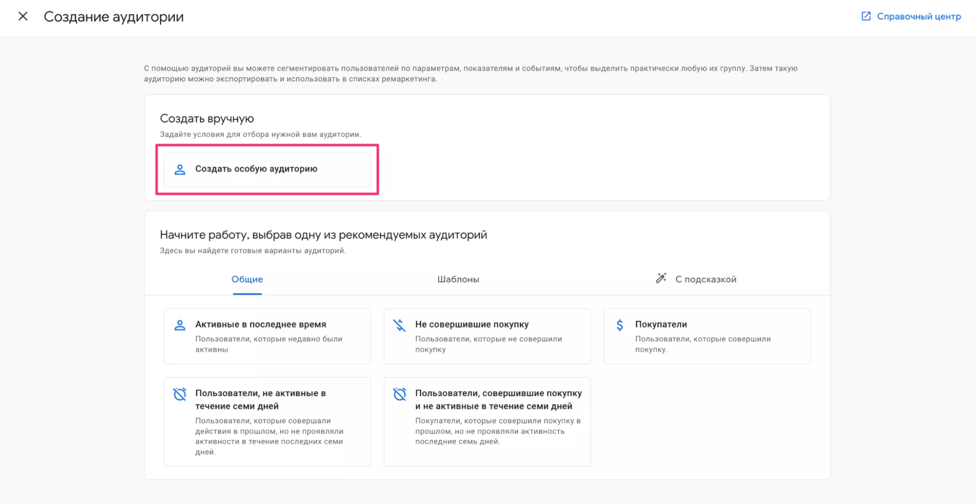 Нажмите «Создать аудиторию», а затем «Создать особую аудиторию».