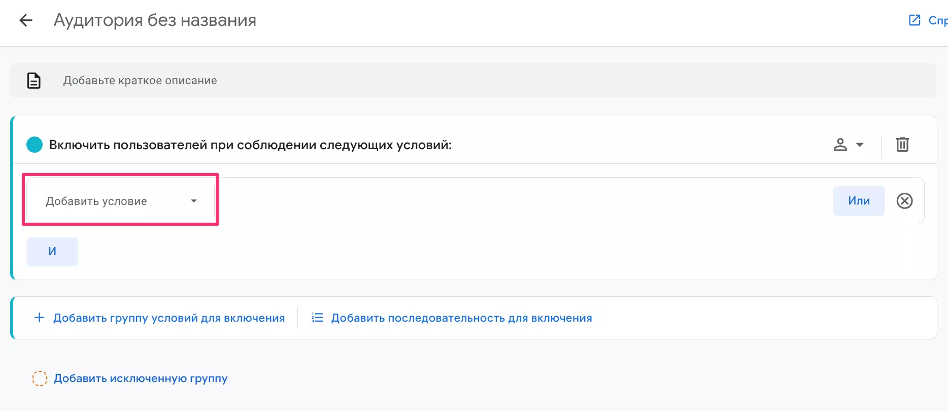При необходимости можно исключить отдельные категории пользователей — например, внутренних тестировщиков, коллег или ботов. Для этого нажмите «Добавить группу условий для исключения» и укажите соответствующие параметры.