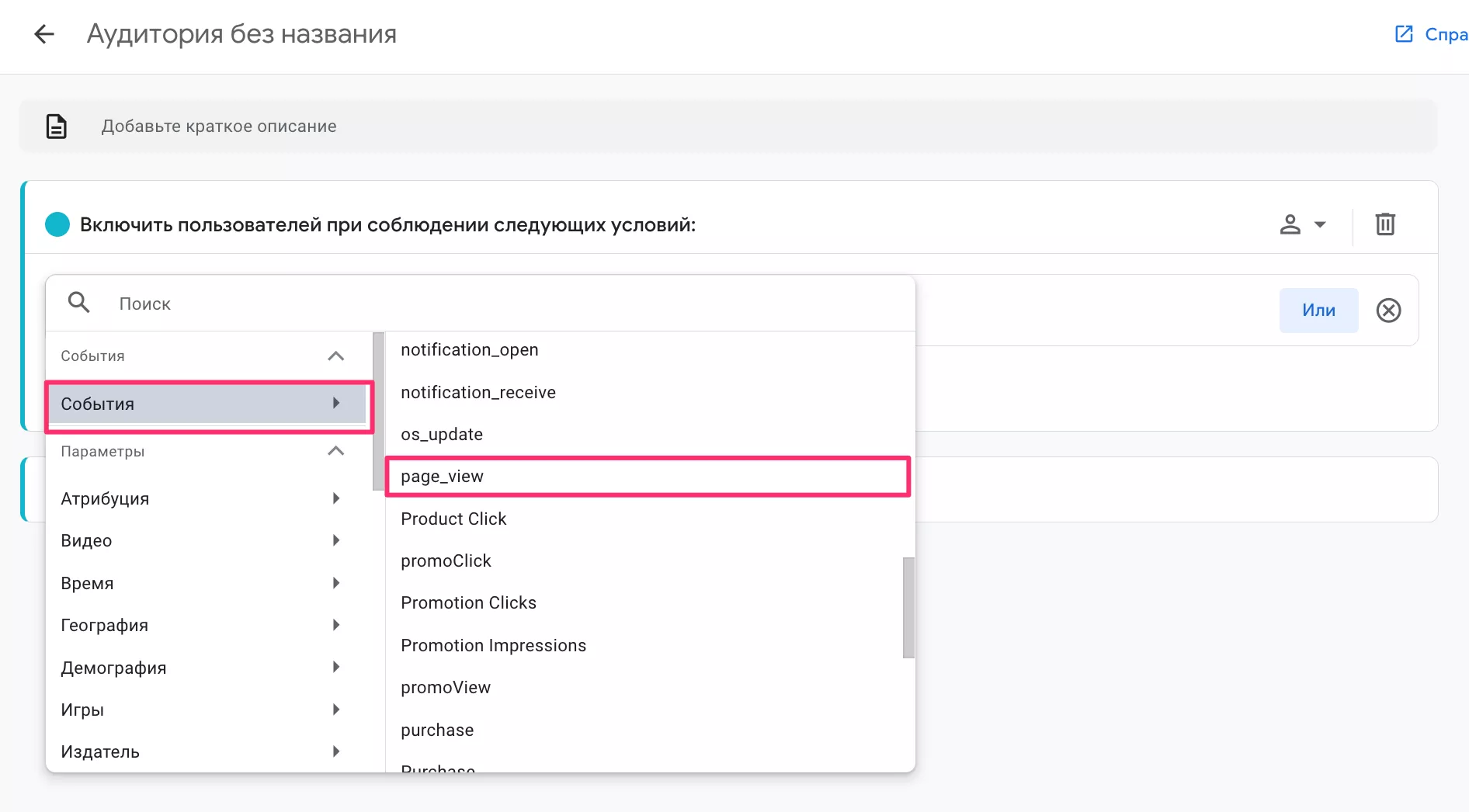 События (Events) — позволяют создать аудиторию на основе конкретного события.