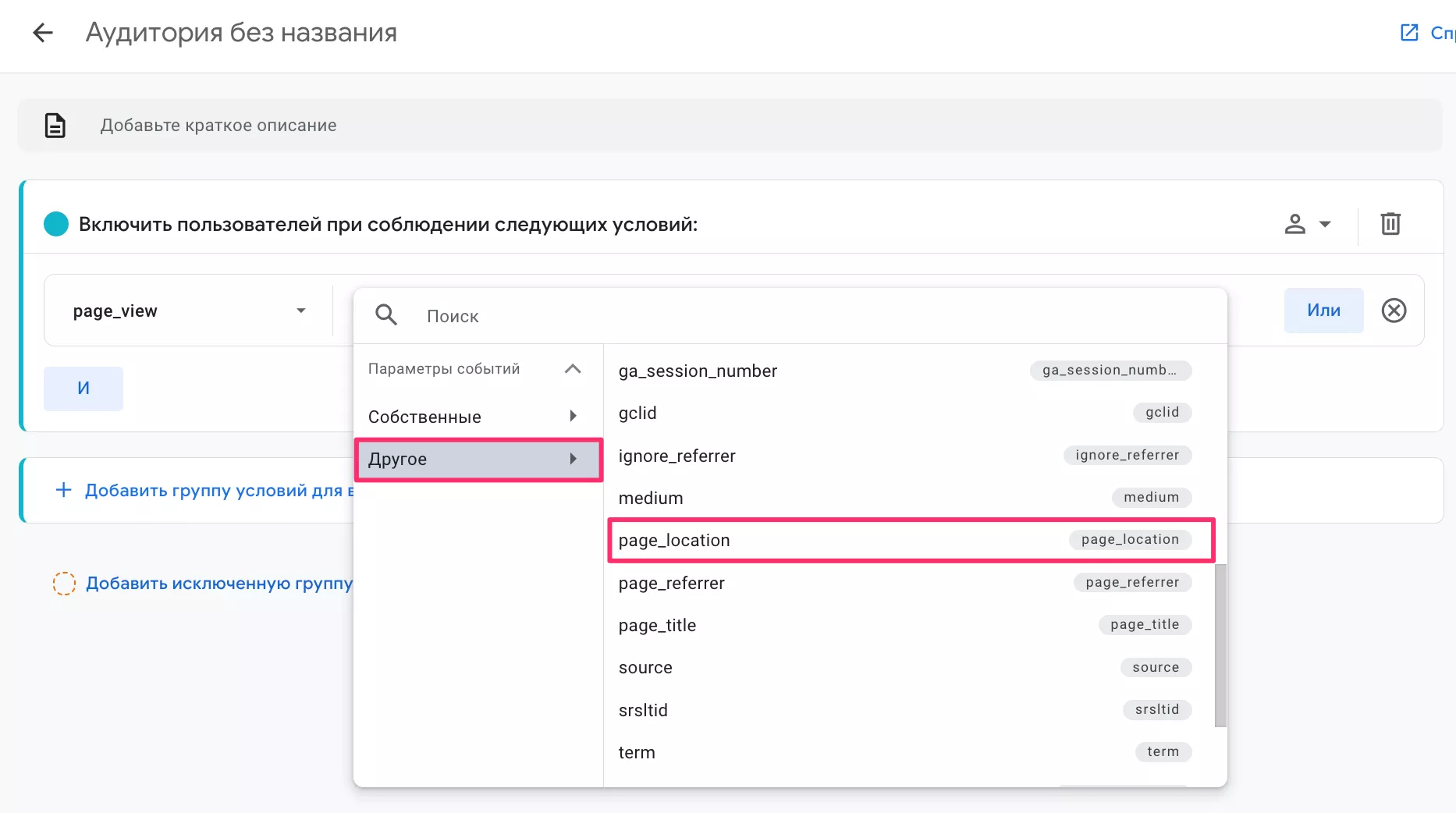 Нажмите «+Добавить параметр», в выпадающем списке выберите «Другое». Выберите параметр page_location (URL страницы).