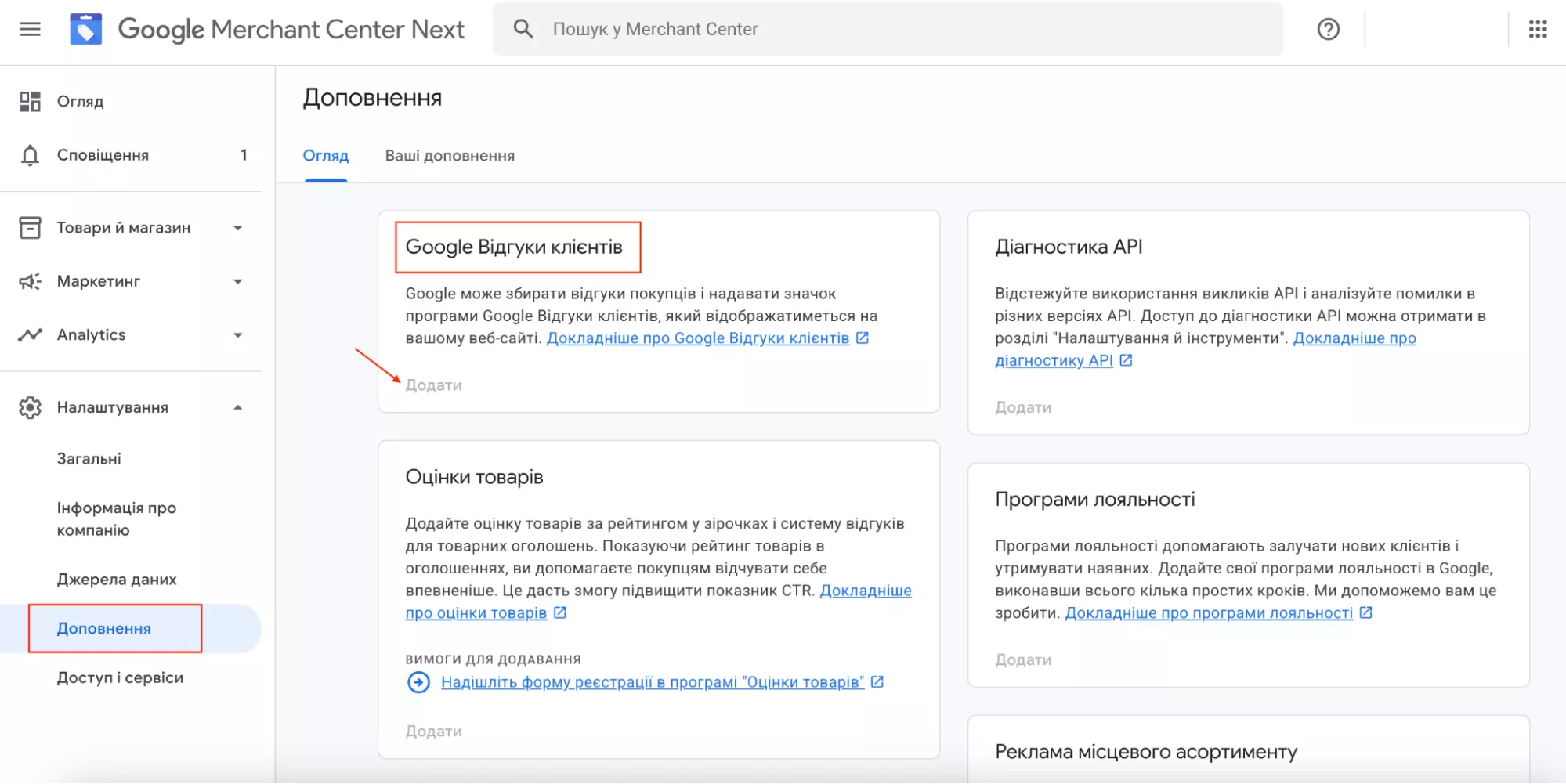 На вкладке «Обзор» найдите карточку дополнения «Google Отзывы клиентов».