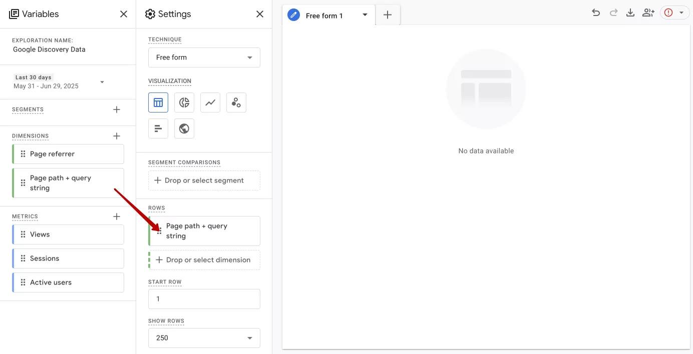 Слева на вкладку Settings (Настройки) в блок Rows (Строки) перетяните параметр Page path + query string (Путь к странице и строка запроса).