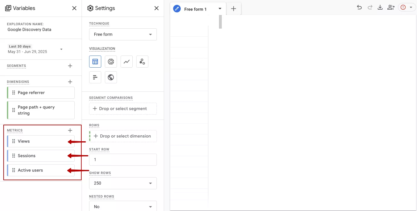 Слева на вкладке Variables (Переменные) в блоке METRICS (ПОКАЗАТЕЛИ) выберите: Views (Просмотры), Sessions (Сеансы), Active Users (Активные пользователи).