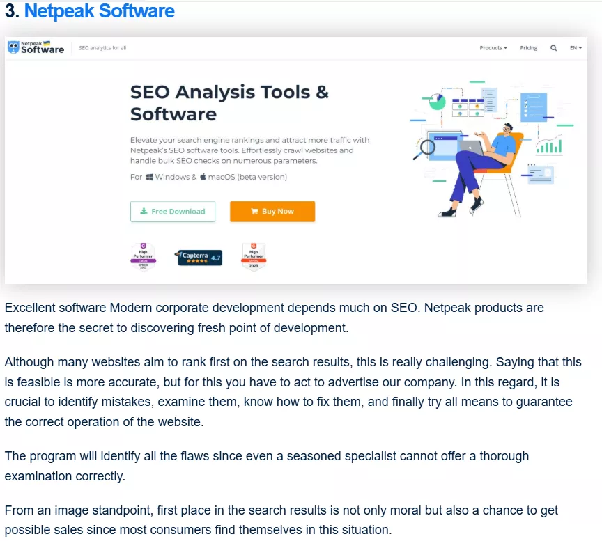 Для примера, обзорная статья о лучших SEO инструментах 20+ Best SEO Software на сайте Plerdy.com. Мы получили не только обратную ссылку из релевантной статьи, но и дополнили ее информацией о Netpeak Software.