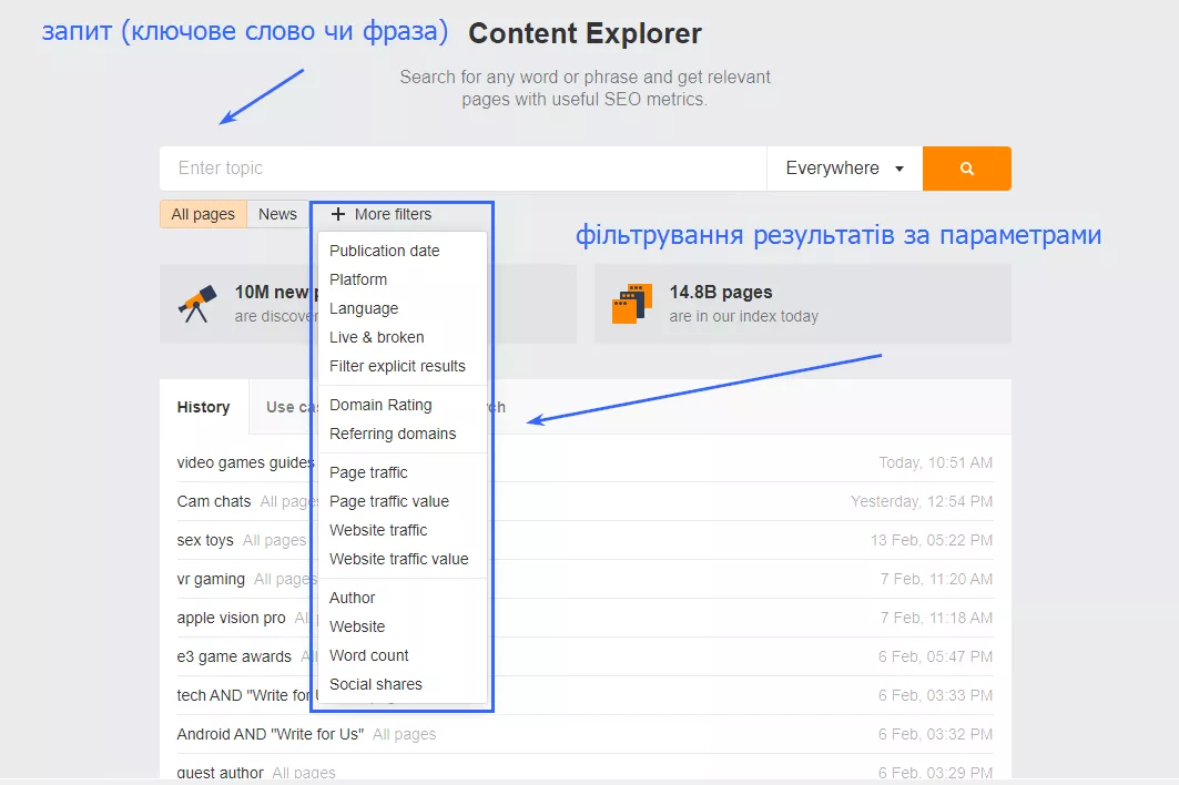 Это инструмент Ahrefs, который помогает найти страницы (домены) по ключевым запросам.