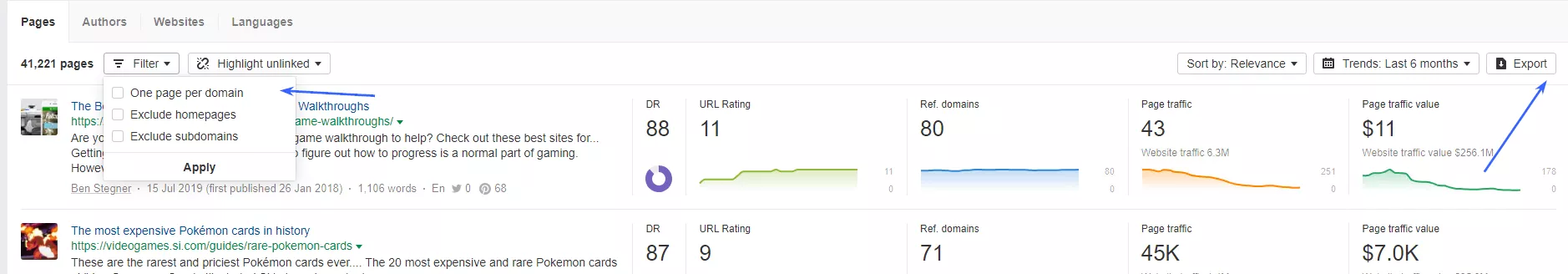 В результатах выдачи Content Explorer вы можете фильтровать по параметрам. Главное, если ищете именно домены, а не страницы, можно выставить параметр One link per domain и сократить количество результатов до одной статьи на один домен (но для вставки ссылок лучше все же смотреть на страницы).