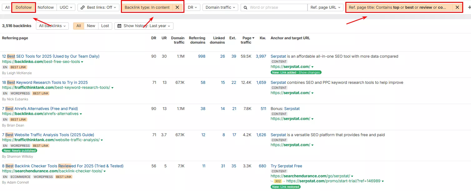 - Title contains: top, best, review, comparison — для того, чтобы отфильтровать страницы, содержащие статьи, которые могут соответствовать необходимым требованиям для вставки ссылок, а именно: