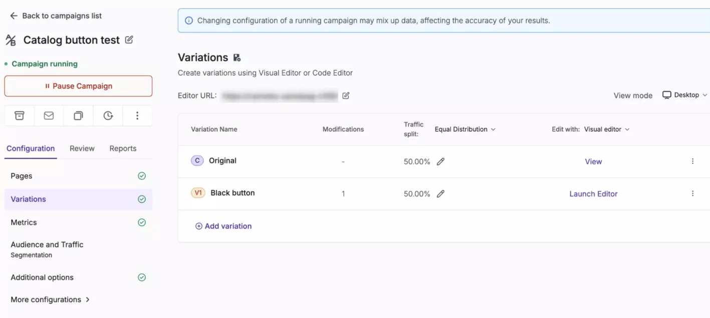 VWO (Visual Website Optimizer) пропонує зручне no-code рішення для експериментів: можна обрати елемент на сторінці, змінити його вигляд у редакторі та одразу запустити тест.