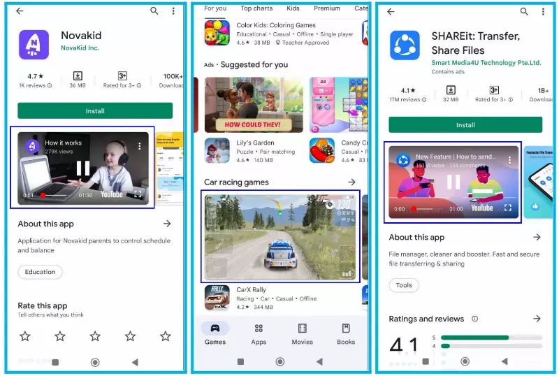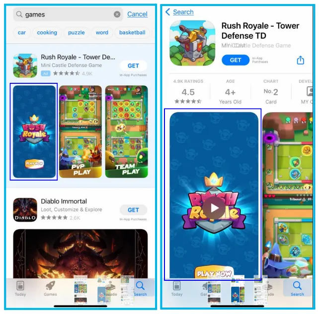 Відеоролик завжди відображається першим. Проте його впровадження не є універсальним рішенням — доцільність використання відео варто визначати через тестування. Для ігор наявність геймплею зазвичай суттєво підвищує конверсію, оскільки демонструє динаміку та механіку гри. Для програм відео спрацьовує не завжди. Іноді статичні скриншоти з чіткими тезами дають кращий результат, ніж ролик.