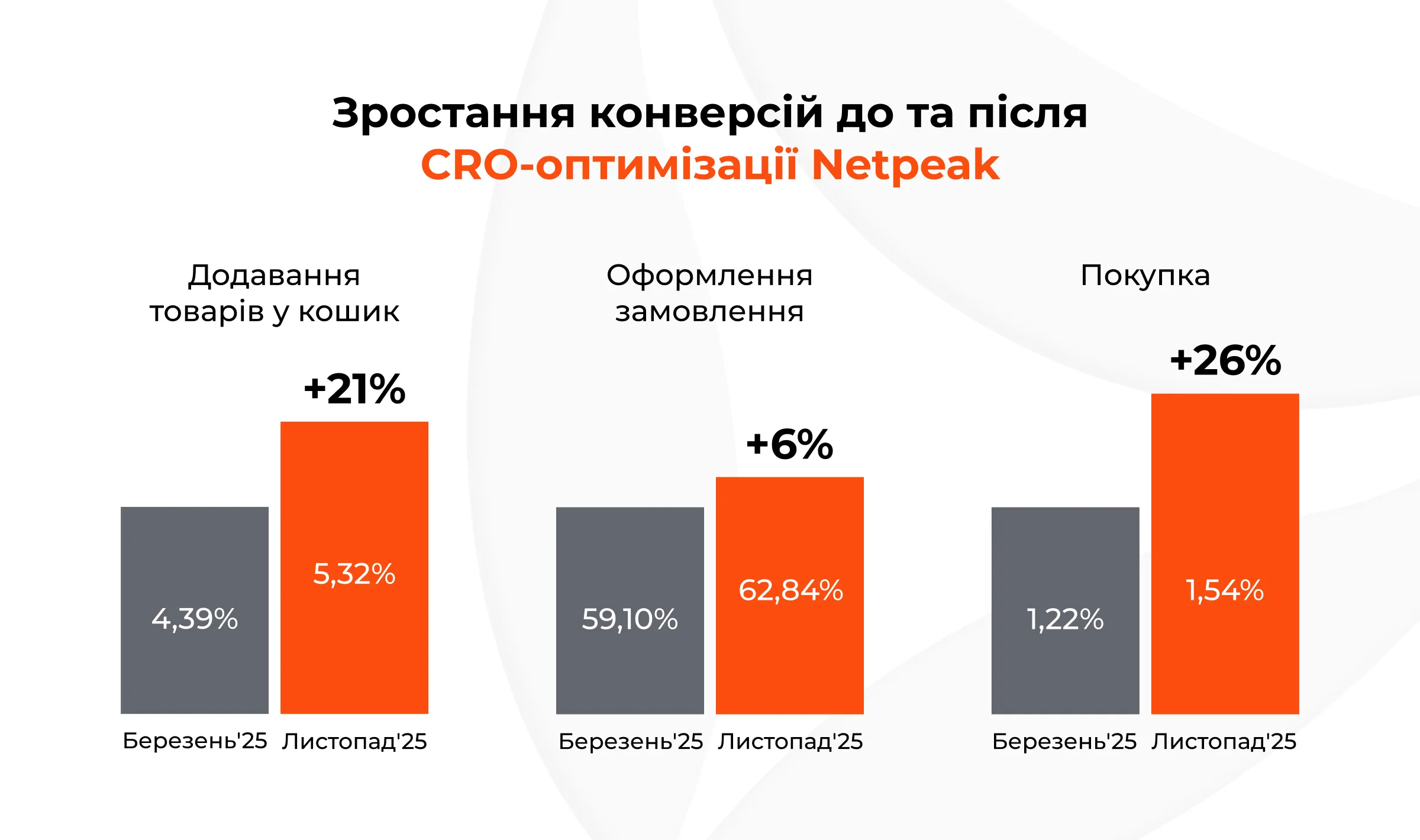 +26% до конверсії в покупку. Результат сукупного ефекту невеликих, але системних UX-змін на всьому шляху користувача.