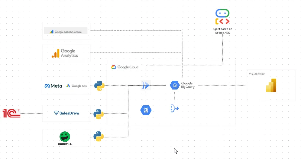 Розберу на конкретному прикладі. У вас є сховище BigQuery, де зібрано докупи все: витрати на рекламу з Google Ads і Meta Ads, дані з GA4, дані й транзакції з CRM.