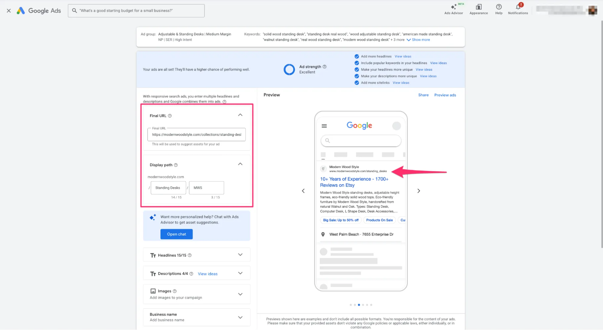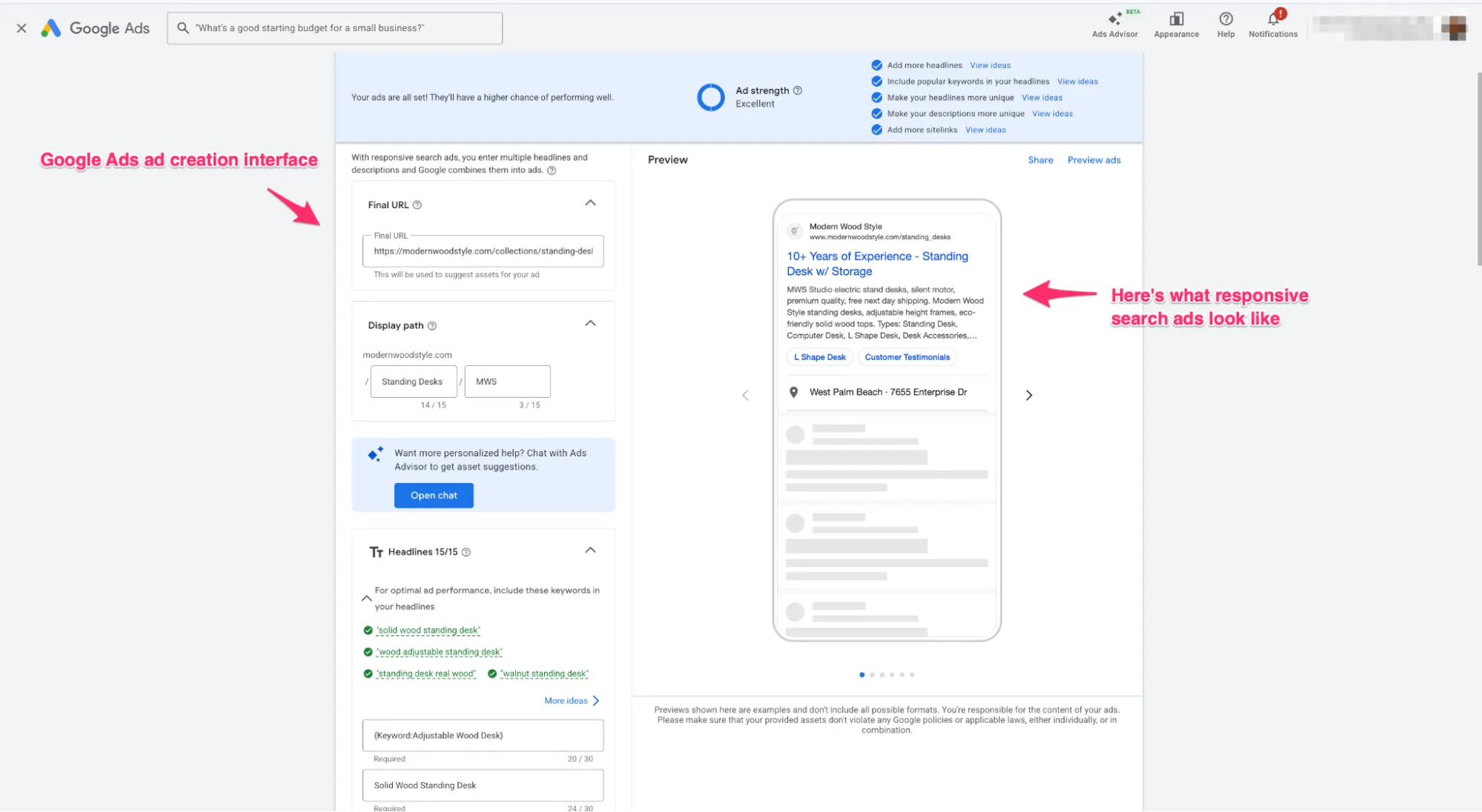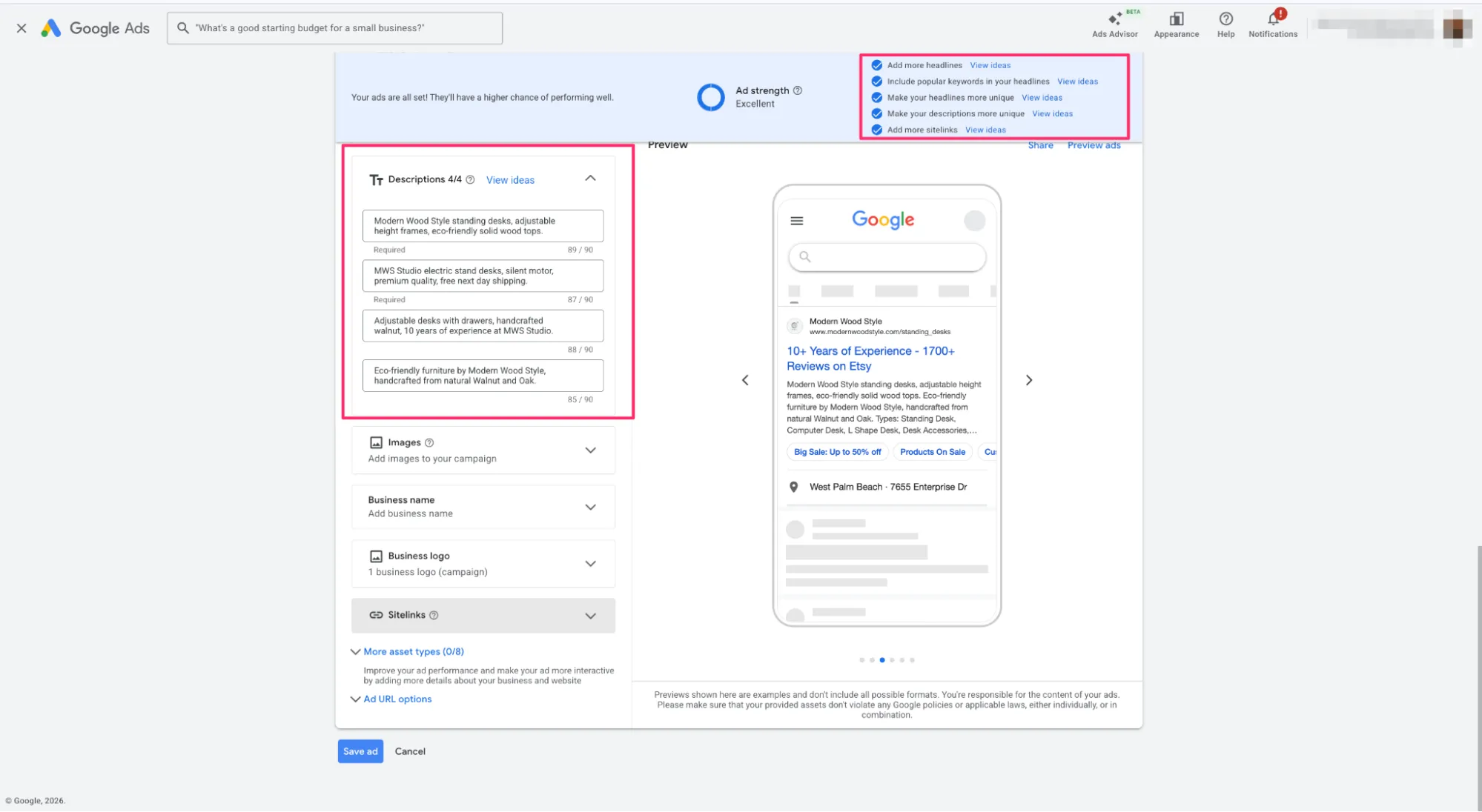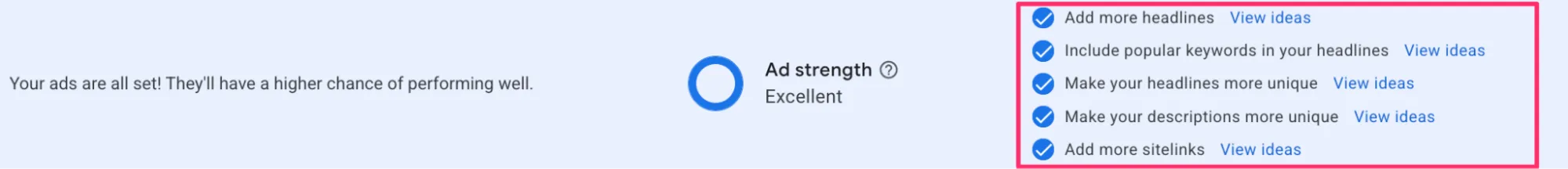 Ad Strength — індикатор (Poor, Average, Good, Excellent), який оцінює різноманітність та якість наповнення оголошення текстами.