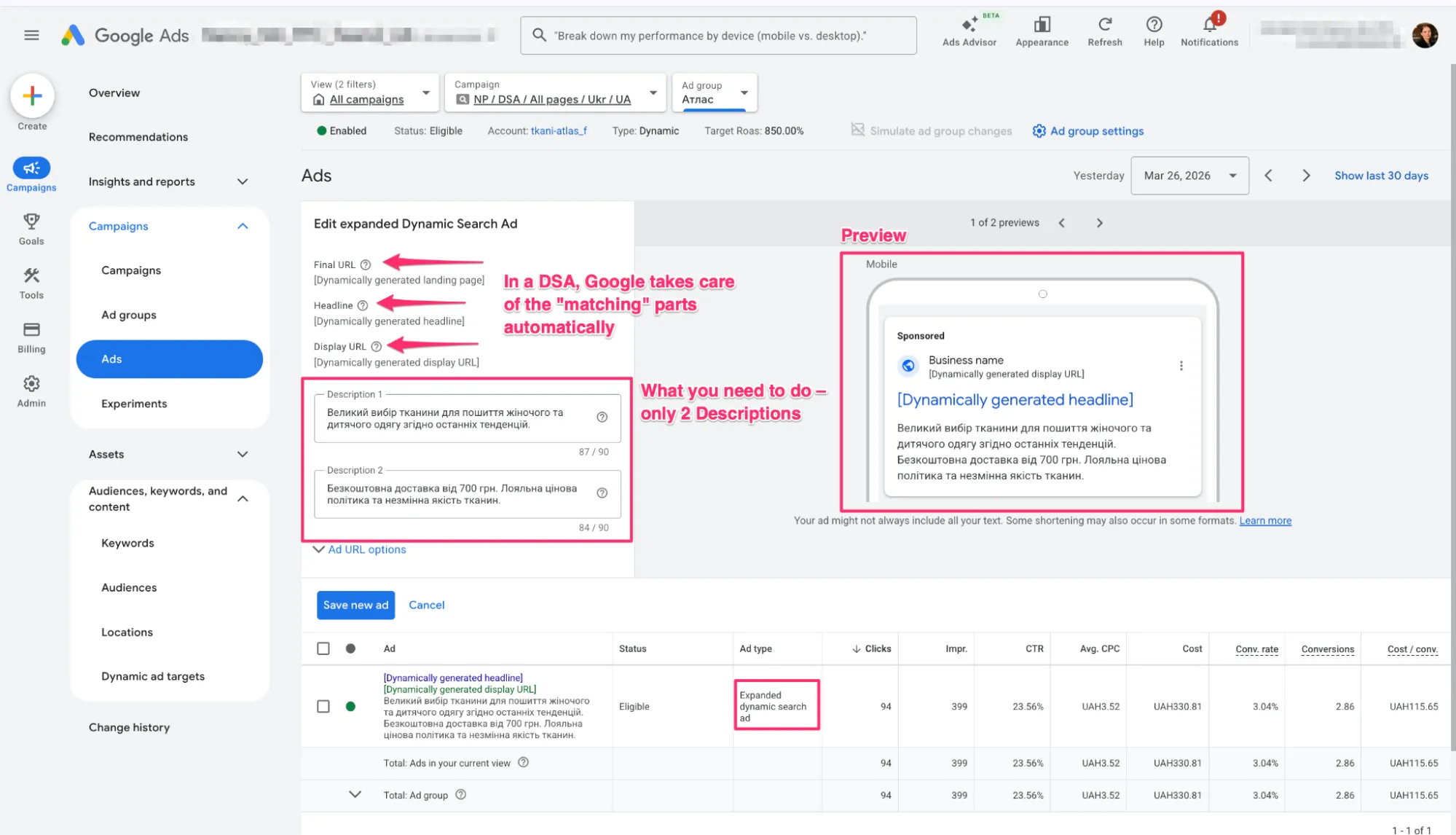 Автоматизація рутини з DSA: для сайтів із великою кількістю сторінок використовуйте динамічні оголошення. Вони автоматично підбирають заголовки під пошукові запити, економлячи ваш час на зборі семантики.