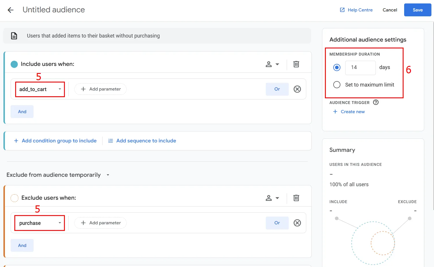 Include users when (включення) — задаємо умови для потрапляння в групу (наприклад, відвідувачі, котрі додали товар у кошик — add_to_cart);