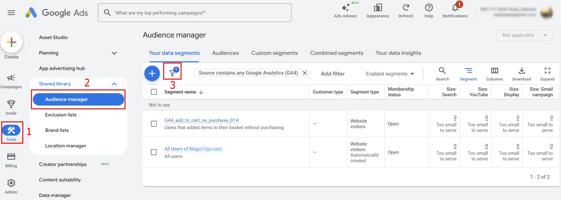 Відкрийте Tools (Інструменти) → Shared library (Спільна бібліотека) → Audience manager (Менеджер аудиторій).